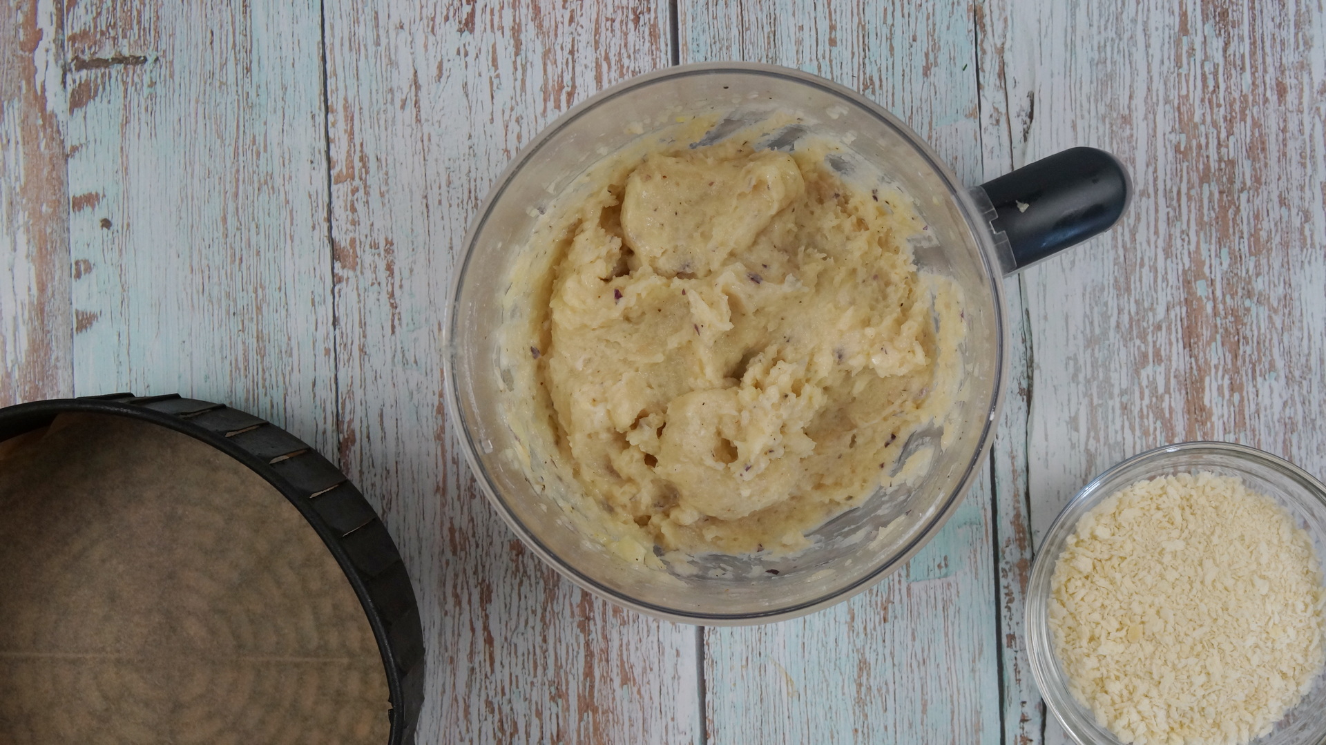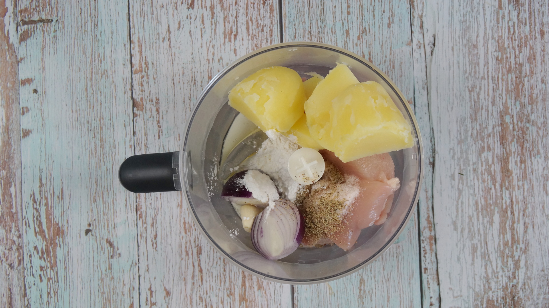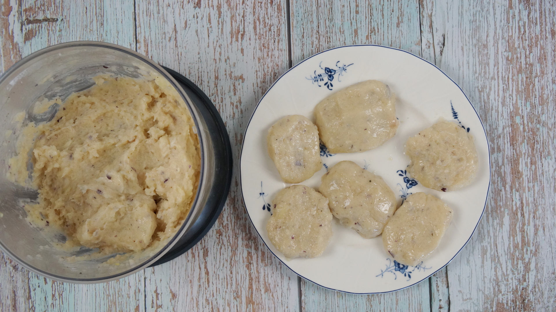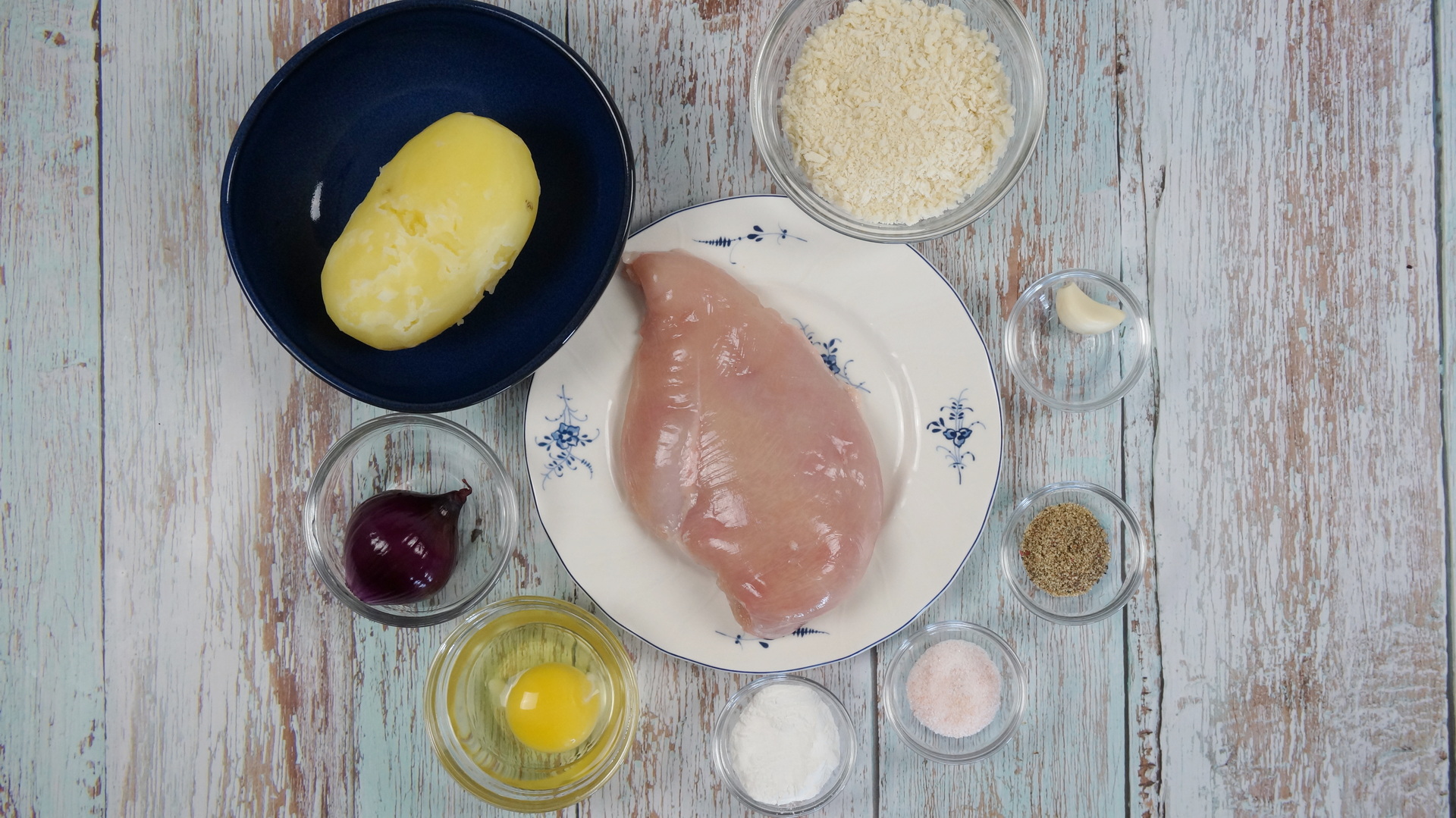 Ingrediente: Piept de pui 300 g Ceapa 1 buc Cartof fiert 1 buc Usturoi 1 catel Ou 1 buc Sare 1 lingurita Piper 1 lingurita Faina de porumb 1 lingurita Pesmet panko