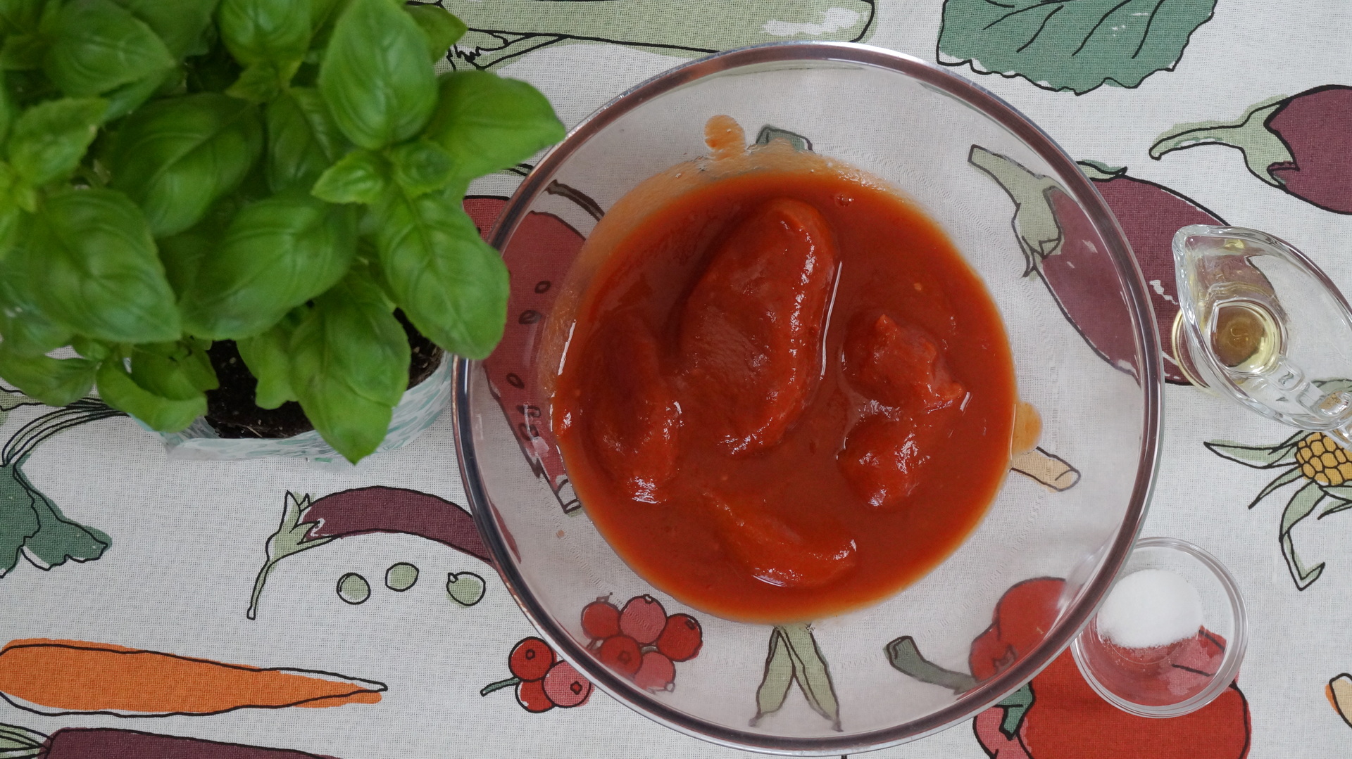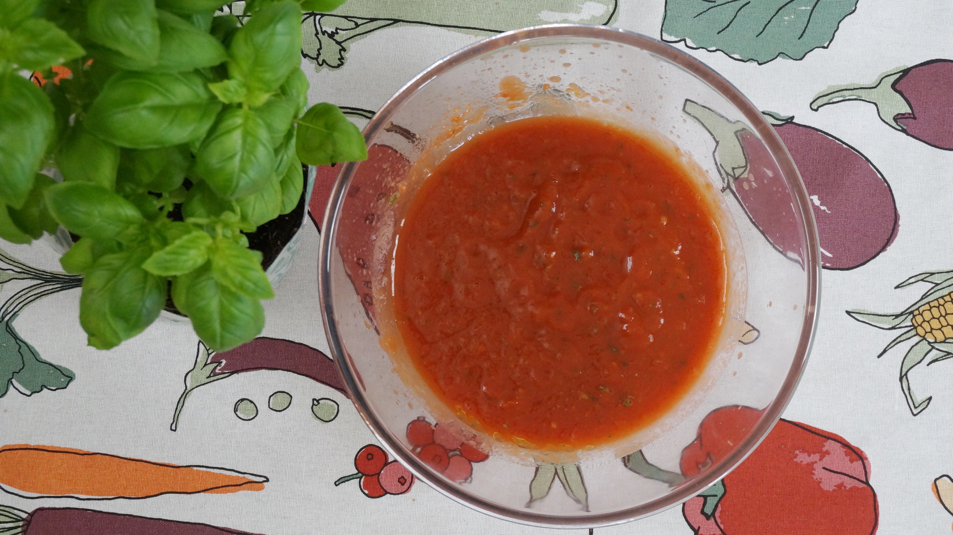 Sosul de pizza se prepara din rosii in bulion, sare, ulei de masline si busuioc proaspat.
