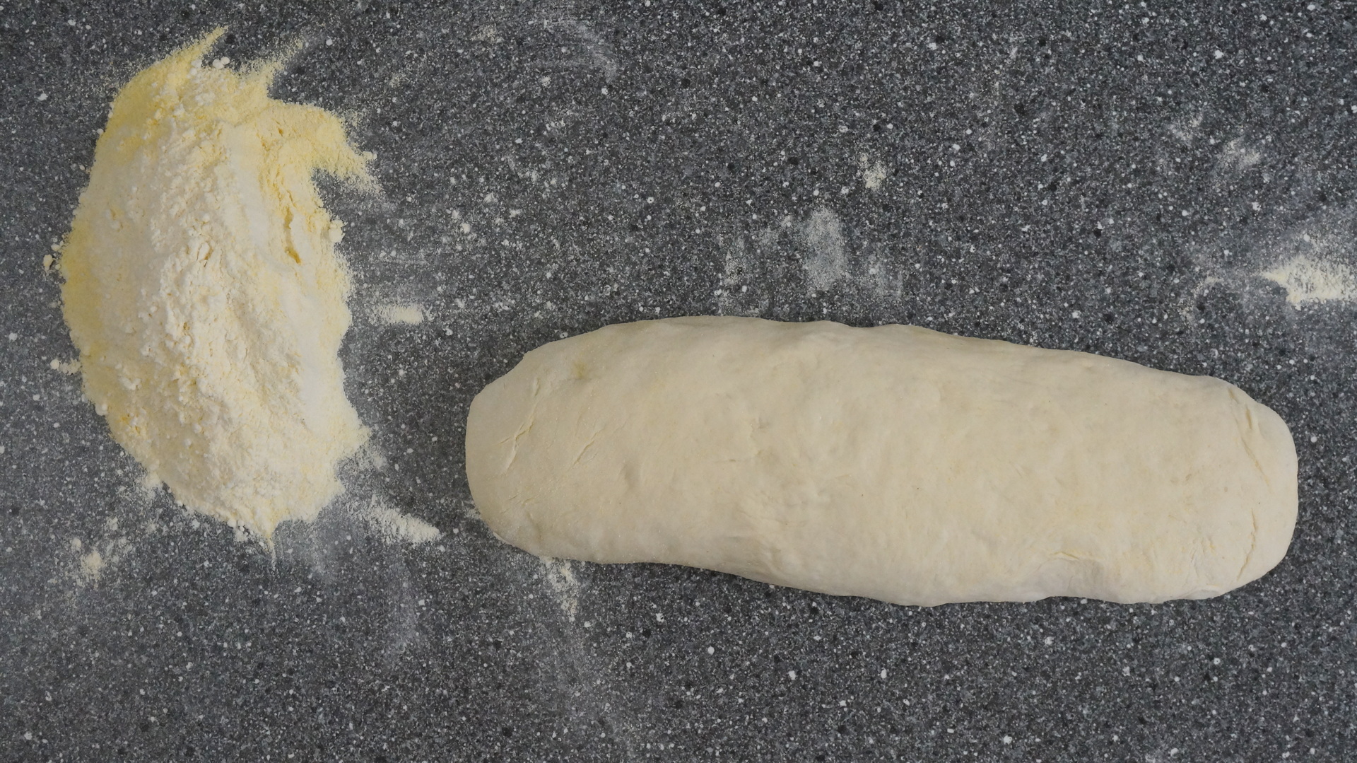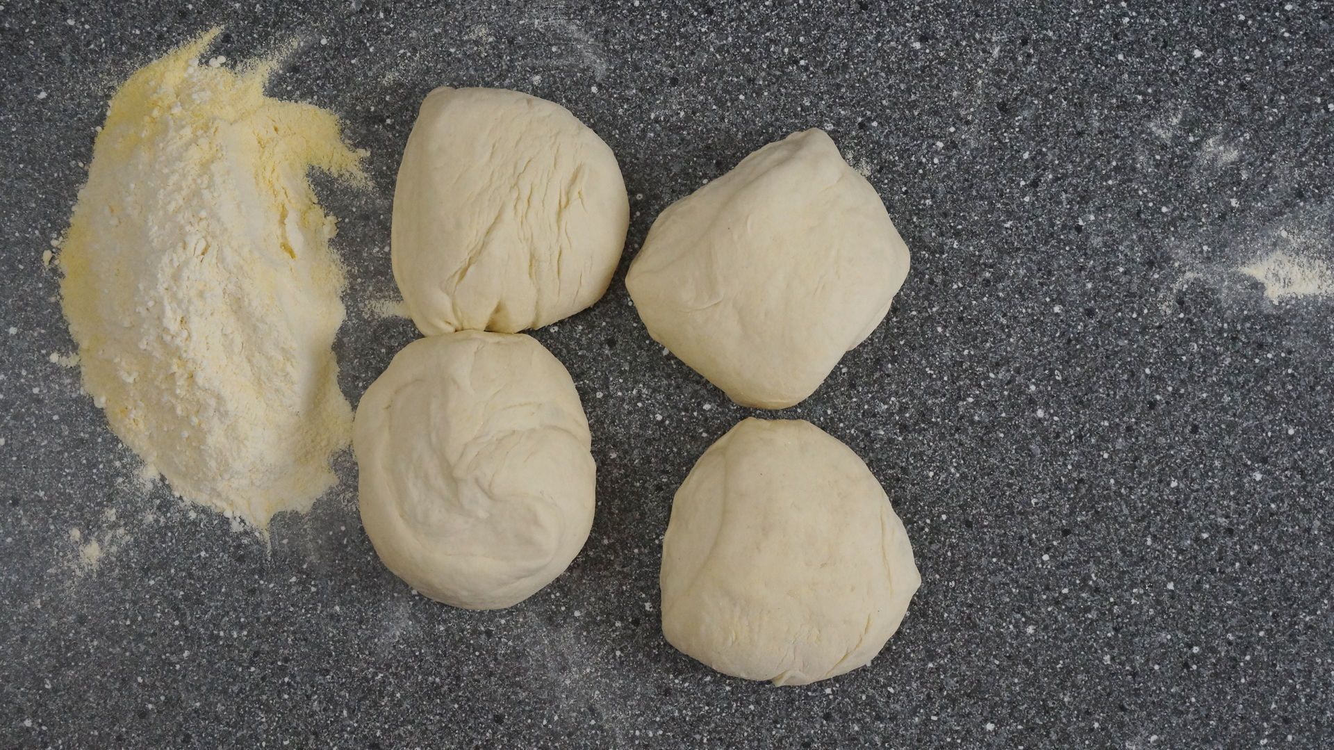 Dupa ce aluatul a dospit, se apasa usor pentru a scoate aerul, se pune pe masa si se imparte in 4 bucati.