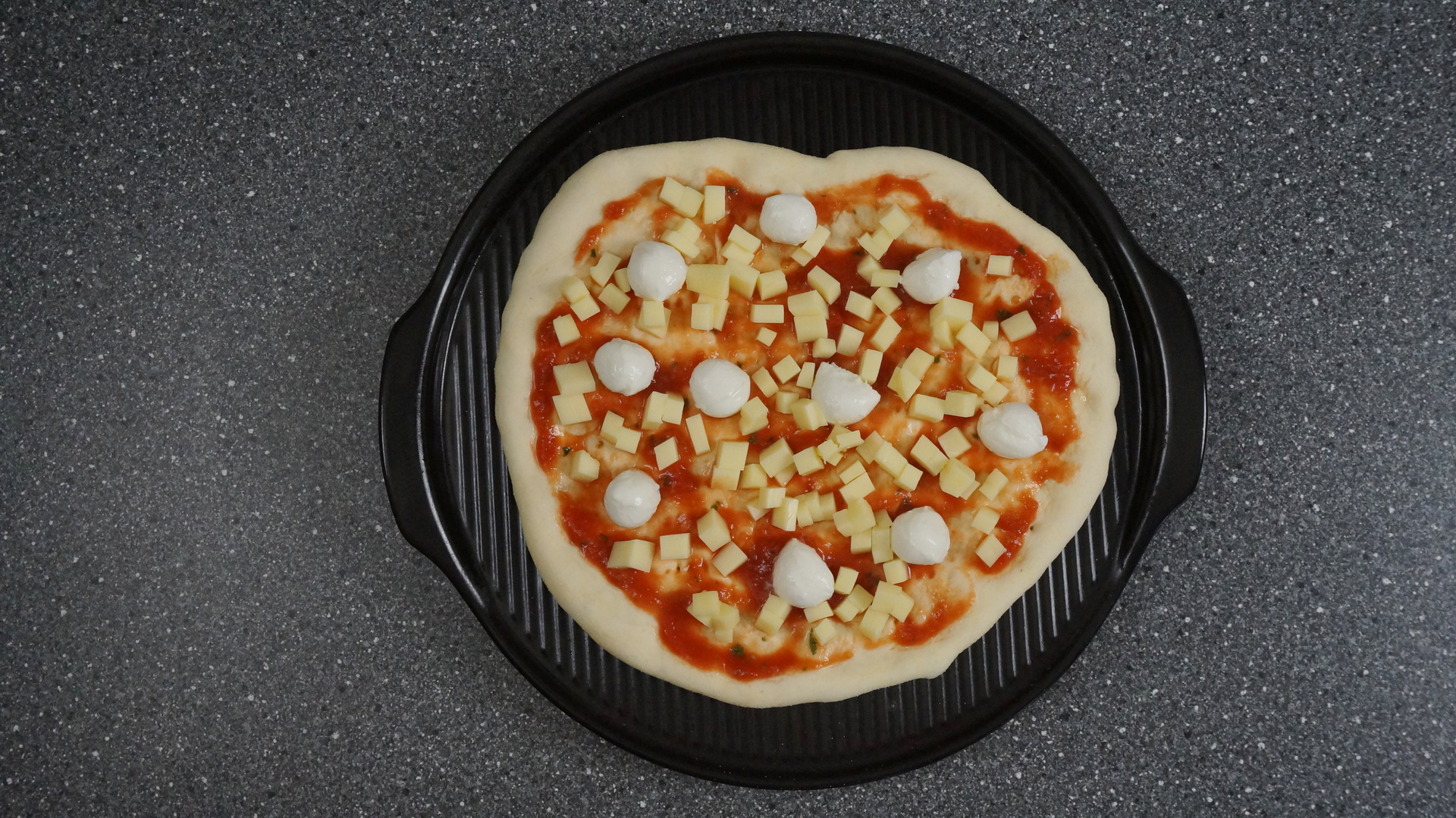 Se poate folosi aluatul pentru a face diverse pizza. Se intinde aluatul cu un sucitor si se pune pe tava de pizza sau pe piatra de pizza. Se poate presara faina de porumb pe tava pentru a face blatul de pizza mai crocant. Piatra de pizza trebuie sa fie preincalzita in cuptor la 220 grade. Se adauga sosul de rosii si ingredientele preferate.